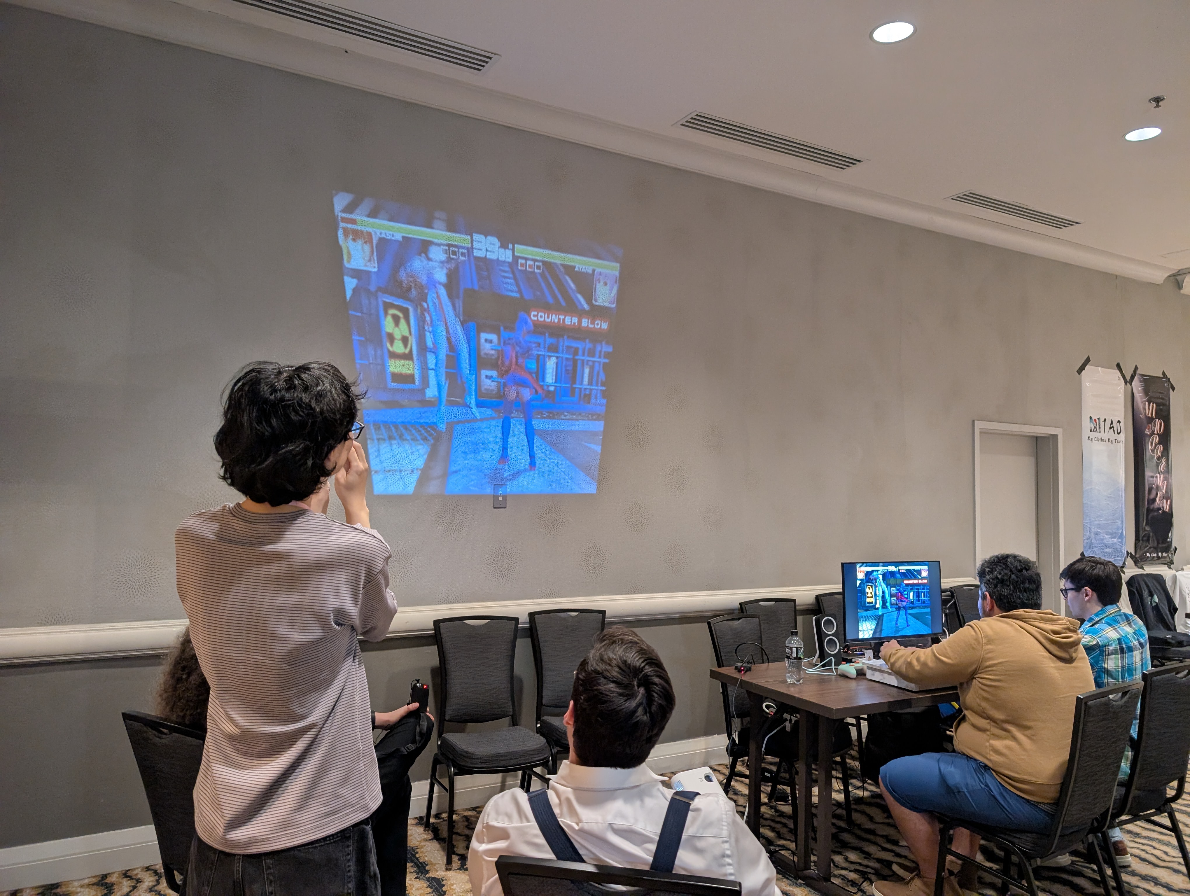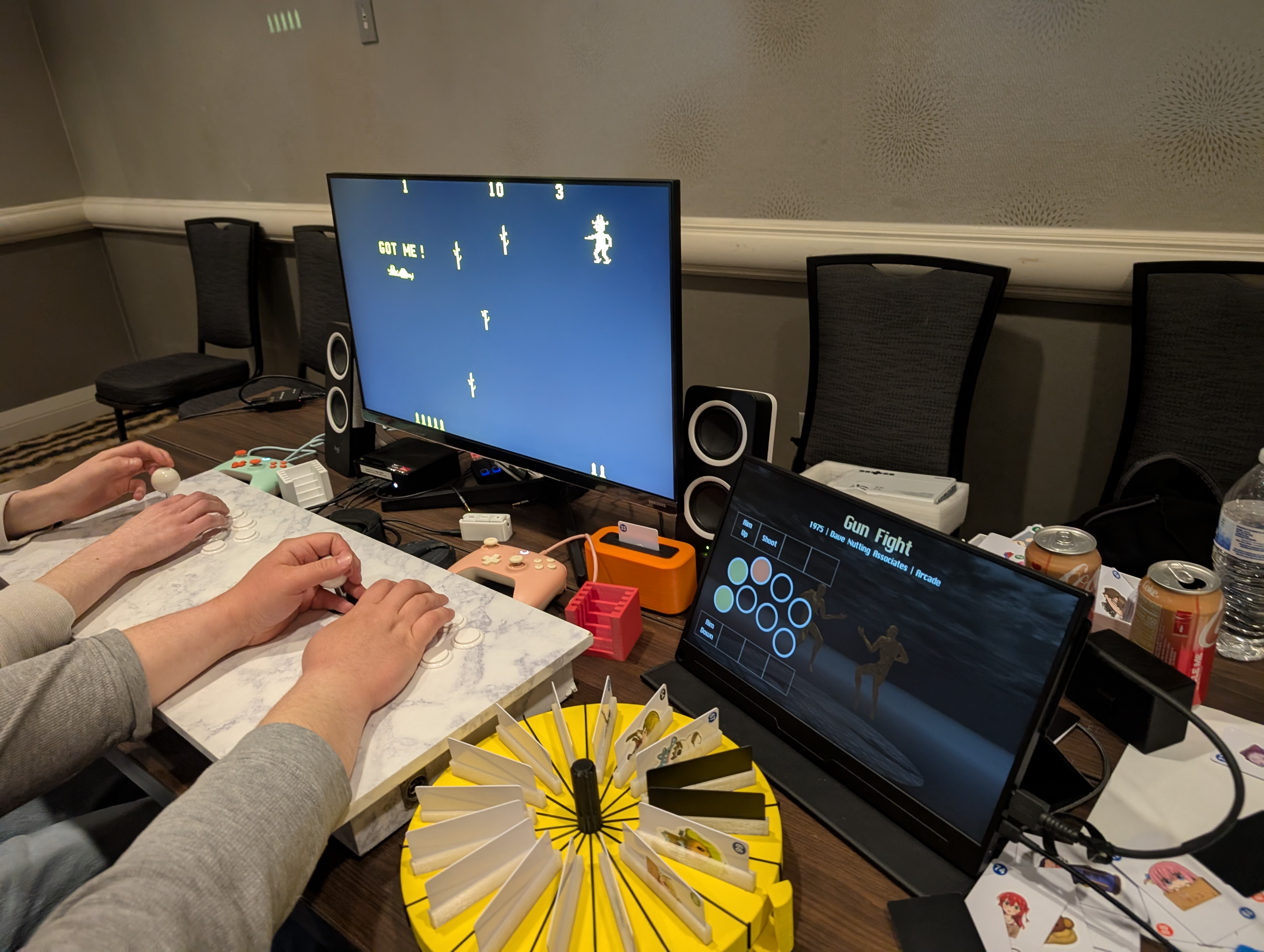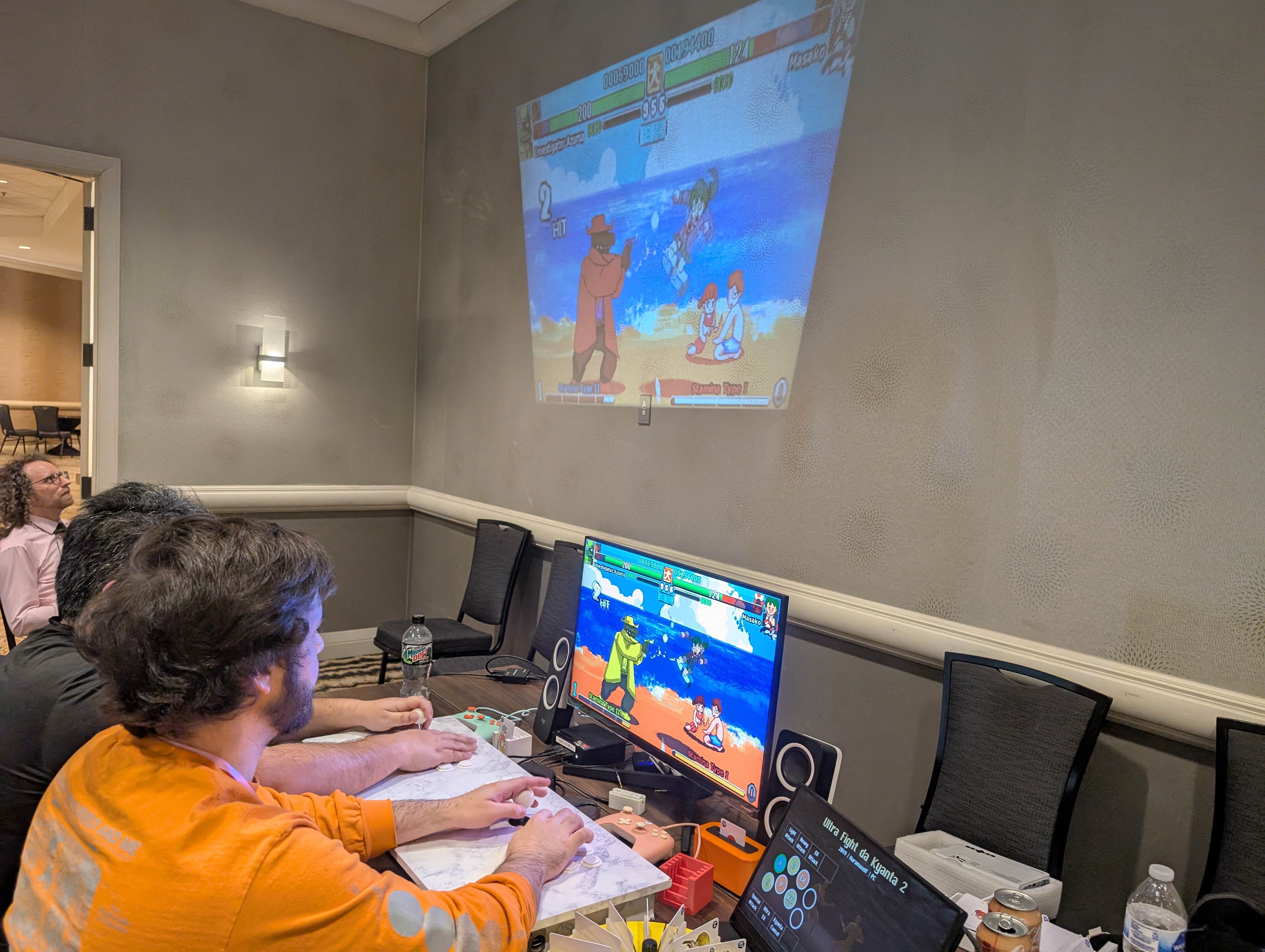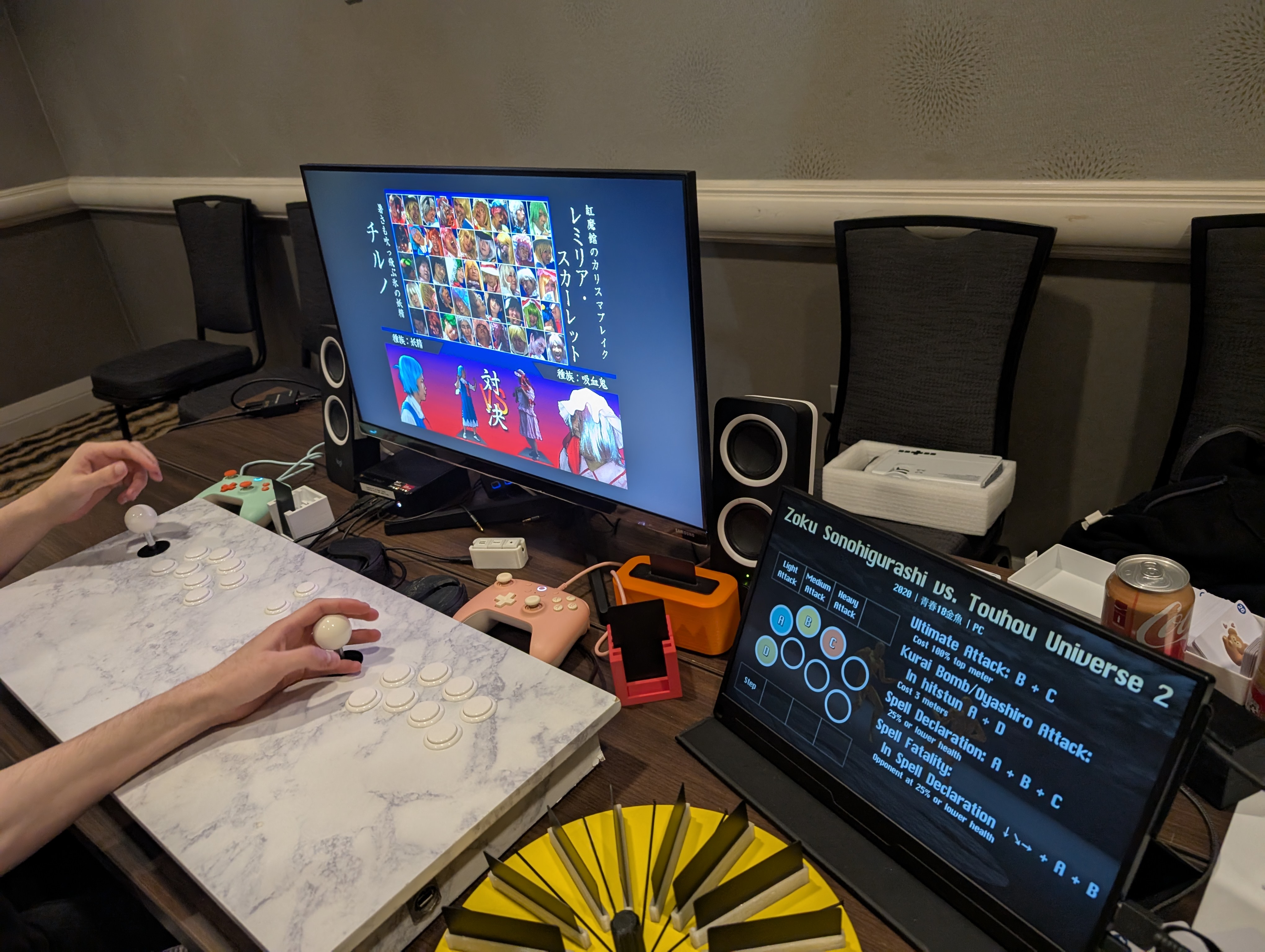 This event took place late in the evening, after five complete rounds of competitive riichi mahjong in the ballroom across the hall where I was holding my own event. I drove 200 miles from Virginia Beach to Alexandria solely to run this tournament at the request of the staff member who generously provided commentary for The Big, Huge Mystery Games Tournament 2, without any plans of playing any mahjong myself. The crowd reactions to strange competitive video games in the periphery of the popular fighting games and the great interest the organizers had in my mystery games setup were the primary motivations for running this event at my own expense. I would like to spread this setup as far as I can do so, but the primary obstacle is the size of the IMB2. I built it wide enough for two players to sit a comfortable distance from each other, with enough palm space for any player. Even though it can be carried by a single person, it is by no means transportable by air without tremendous cost. The two control PCBs within run GP2040-CE, and any attempts to minimize the controls for better travel will need to retain them. The secondary obstacle is the cost of travel.