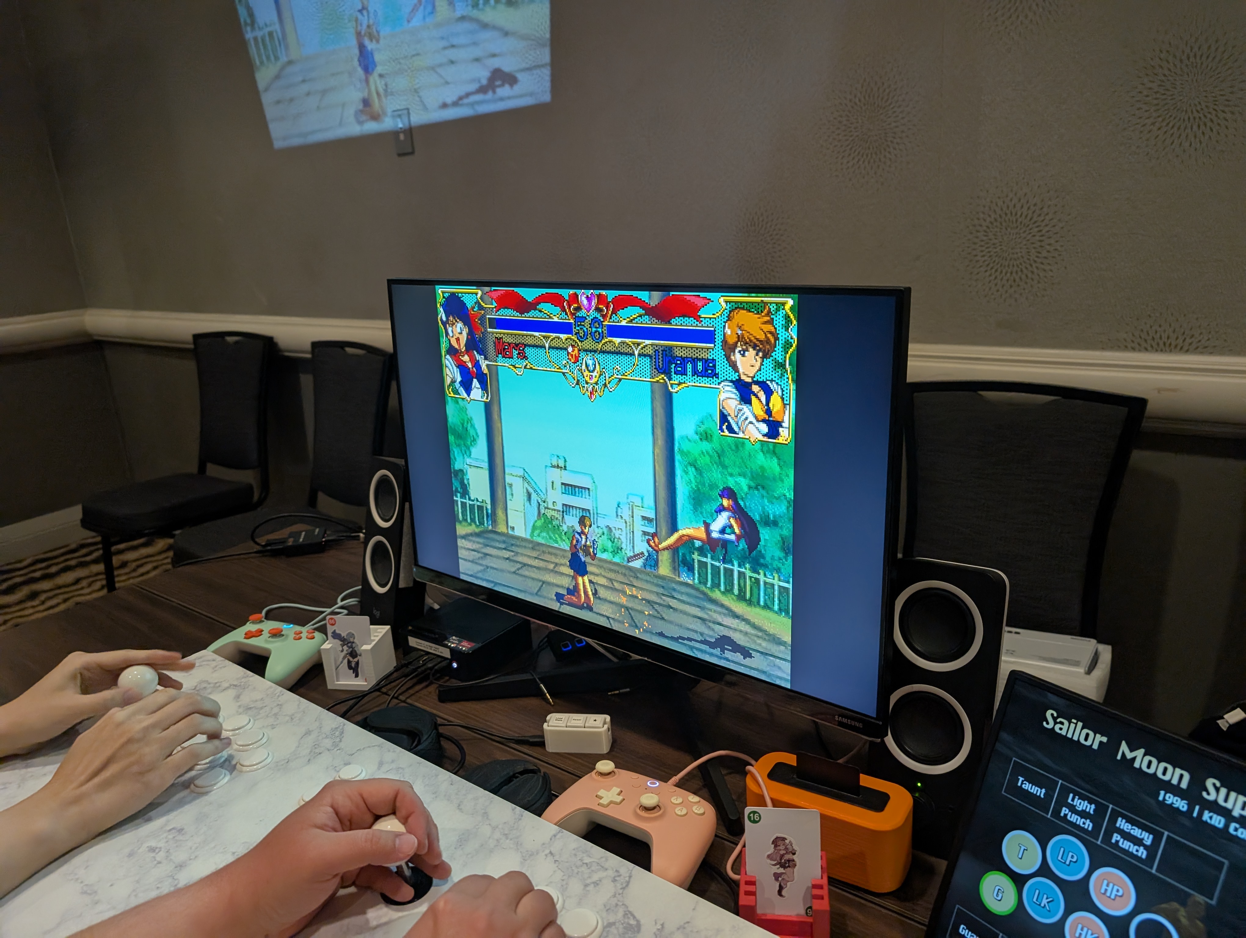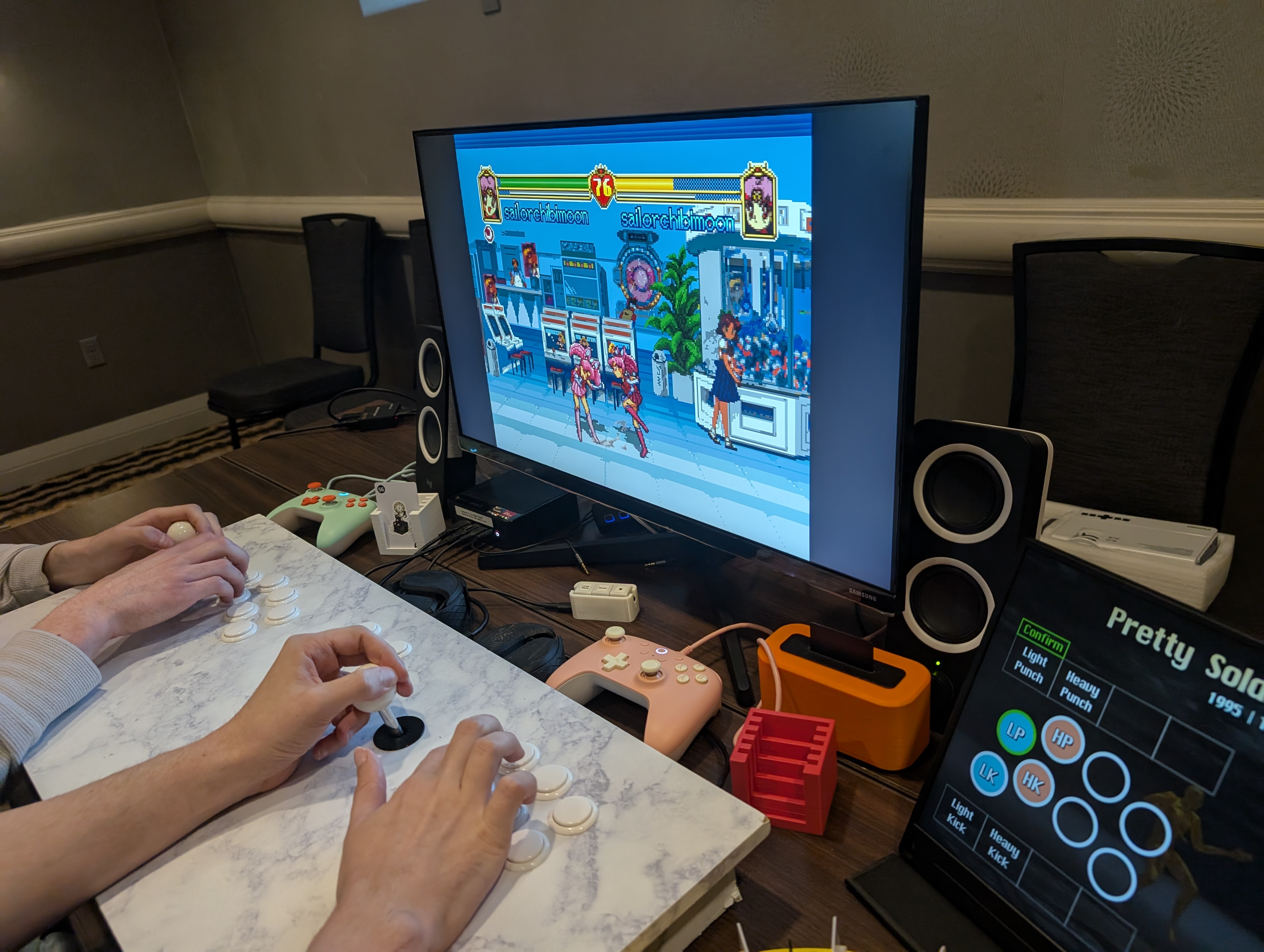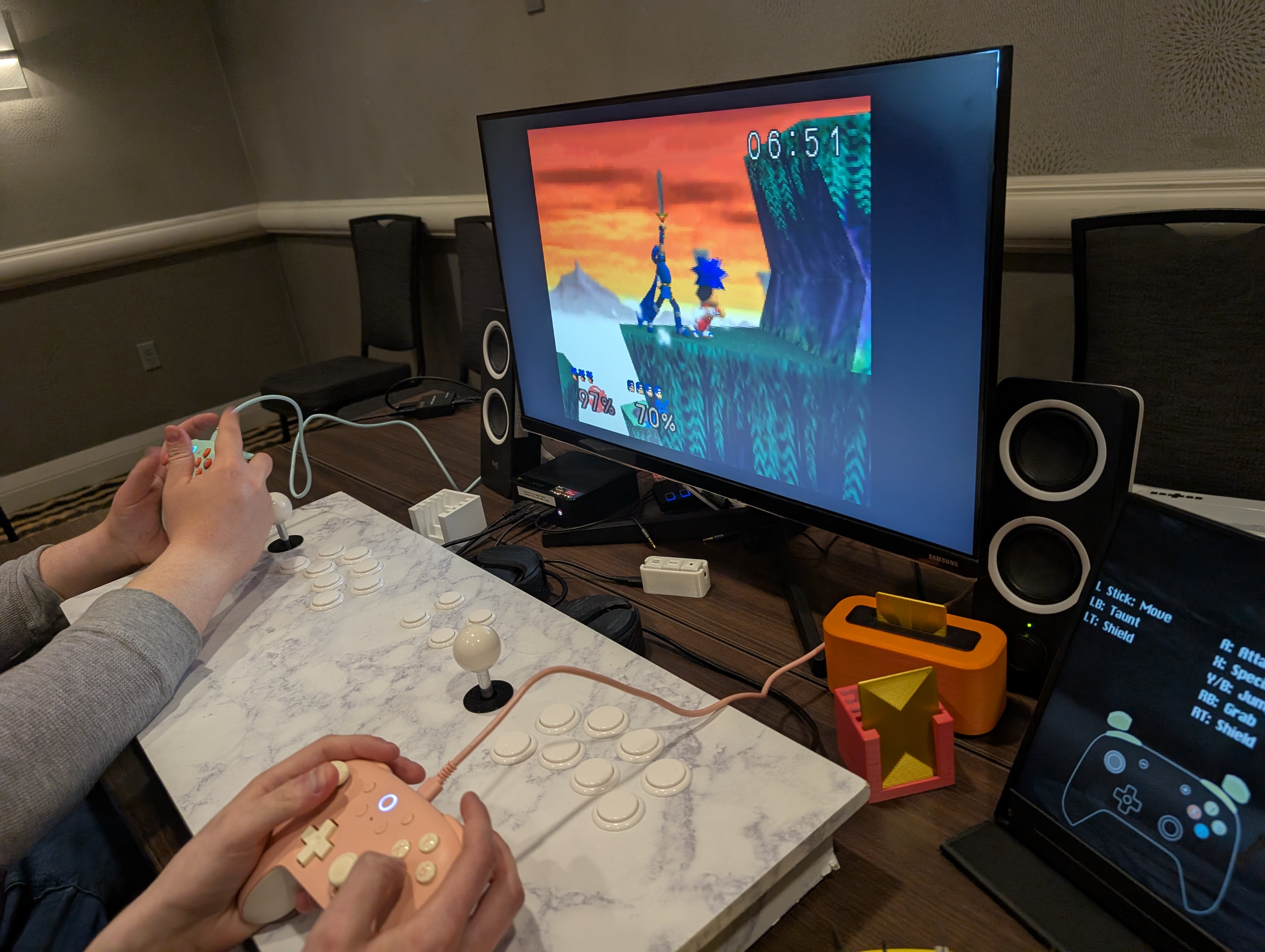 Last year, I bought a pair of 8BitDo wired controllers to allow running games that cannot be comfortably played with arcade controls. I prepared several games to be played with these controls for the MAGFest tournament, but none got selected. This year, two such games were played: ChuChu Rocket and Smash Remix, both in grand finals. Introducing two more controllers to the PC causes issues with some emulators regarding controller order, particularly with Flycast, which is already inconsistent with controllers that share the same vendor ID. It is especially important for my use case that controller order is not changed for any reason, due to the IMB2, the double-wide, marble-patterned two-player arcade construction of my design that I use for the majority of games, and the unexpected reversal potentially causing incorrect match results to be reported. Flycast reversed the player order for the Dreamcast games in spite of testing I did earlier that day, so I will likely need to use the Flycast core within RetroArch for these events in the future, as RetroArch has proven more reliable in preserving controller order after some adjustments and upgrades I made after the MAGFest tournament. This snafu with controller order was the only issue with the software this tournament, and it did not require me to abort or replace any games.